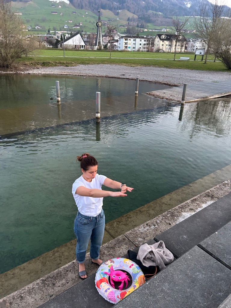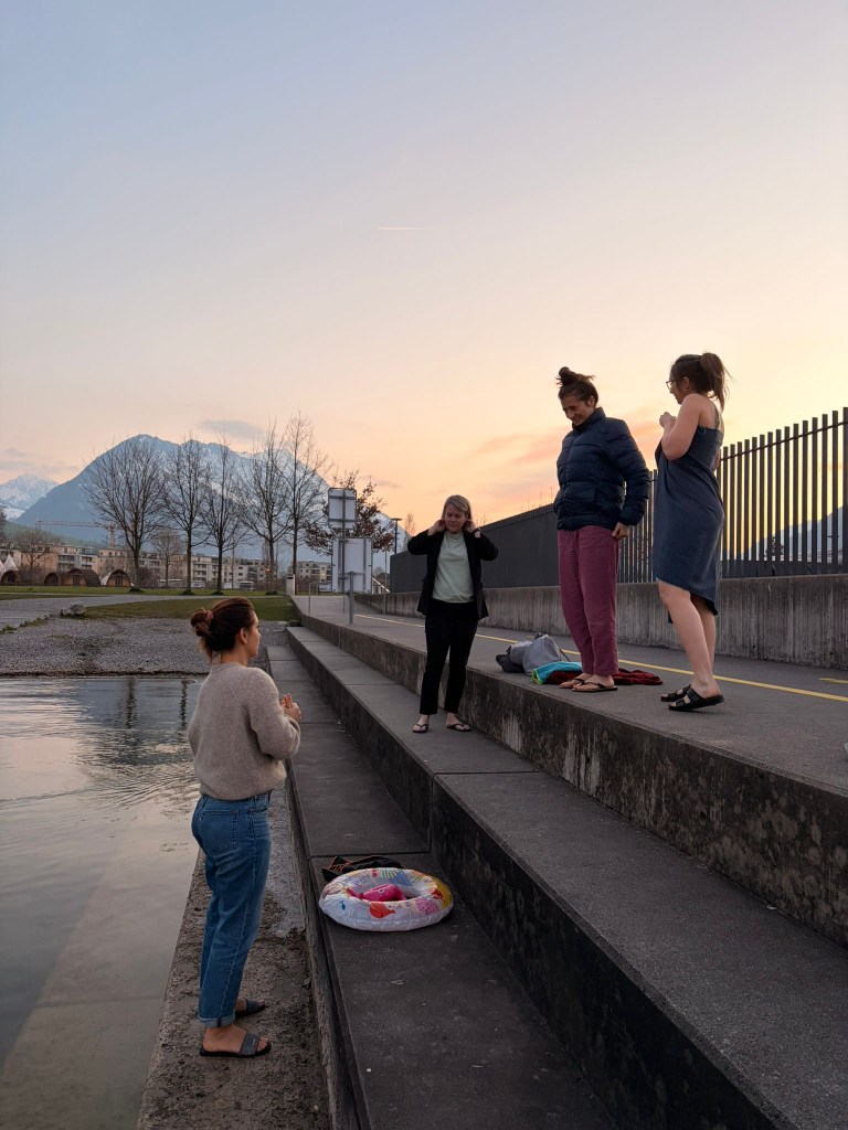 Bevor wir uns unserer grossen Challenge stellten, bereitete uns Magdalena mit gezielten Atemübungen auf das bevorstehende Kaltbaden vor. Gemeinsam zur Ruhe kommen, den Fokus nach innen richten und den eigenen Körper bewusst wahrnehmen – eine wichtige Grundlage für das, was gleich folgen sollte.