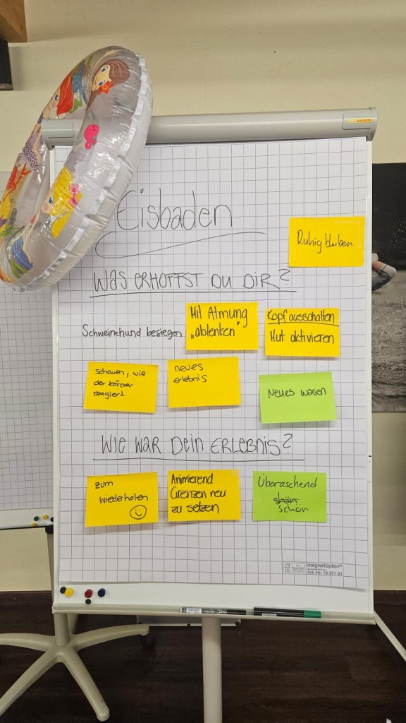 Und dann ging alles ganz schnell – geführt von Magdalena standen wir plötzlich im kalten See. Ein Moment, der Überwindung kostete, aber gleichzeitig unglaublich belebend und kraftvoll war. Ein Erlebnis „out of our comfort zone“, das uns allen noch lange in Erinnerung bleiben wird.